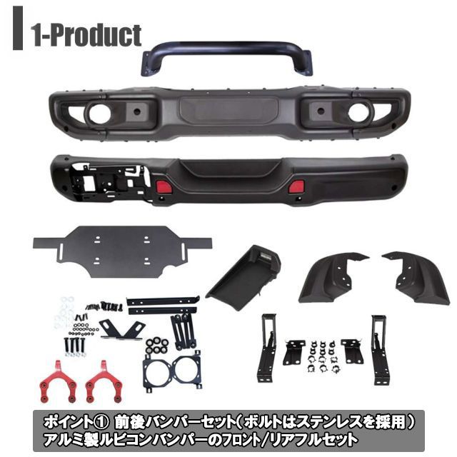 ・素材:アルミ ・ブラックパウダーコート仕上げ ・オフロードスタイルに必須のオーバーライダーが付属します。 ※画像の車両はバンパーエクステンションを敢えて外して仕上げています。オーバーライダーを外して装着も可能です。 ※フロントのLEDフォグは純正流用となります。商品には付属しません。 ※ナンバープレートを取り付ける際は別途ナンバーステー等のご使用をお勧めいたします。 |