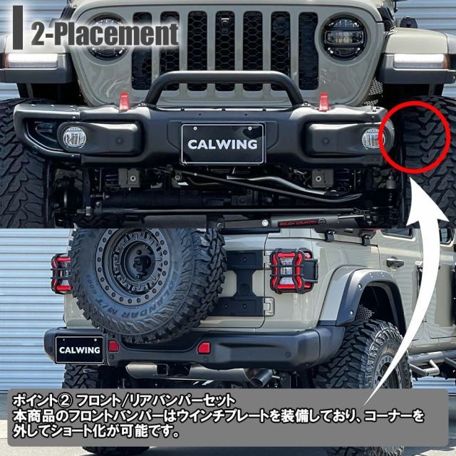 北米仕様ラングラーJLルビコンは専用バンパーが装備されていますが、国内ディーラー車はルビコンでもサハラと同一のバンパーとなっており、カスタムしたいポイントとなります。 こちらは国内ディーラー車にお乗りのオーナー様におすすめのルビコスタイルバンパーフロント/リアセットです。純正スポーツ、サハラなどを本国ルビコン仕様にカスタムが可能! 本体にはセンサーホールが装備されており、ディーラー車などのパークセンサーも機能します。しかもサイド部分が外れて簡単にショートバンパーに変貌します!2パターンで楽しめるところ魅力です。 |